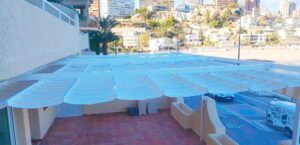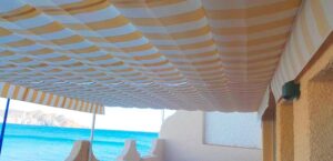 Estos toldos pueden ir entreparedes, que no requiere pilares, ya que va fijado directamente entre las paredes perimetrales o en el techo.