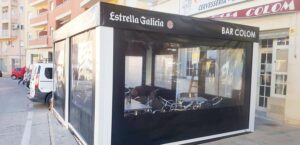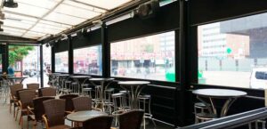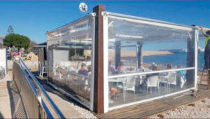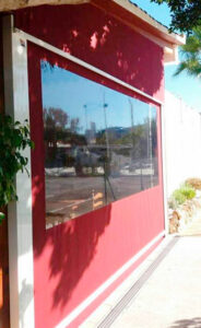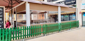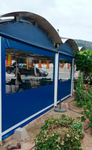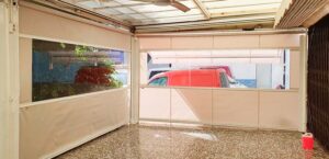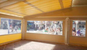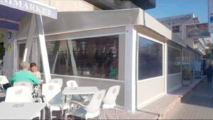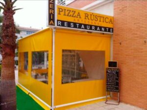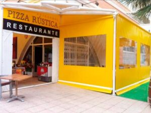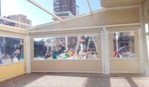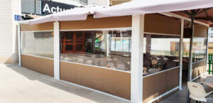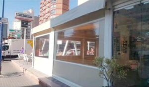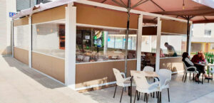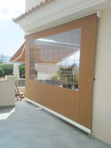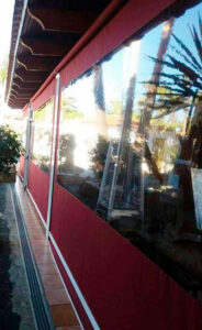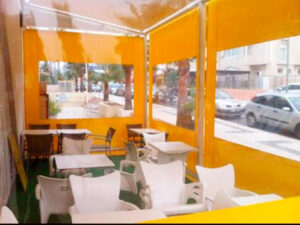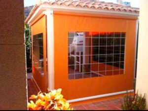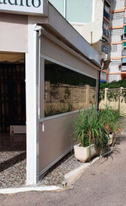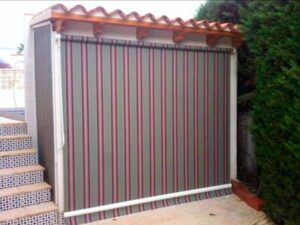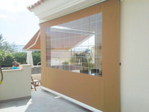 Toldo lateral (caída vertical) es un toldo bajante ideal para porches y terrazas particulares, como para cerramientos de cafeterías, diseñado para proteger del clima (por eso se le llama también cortaviento) además de dotar privacidad.